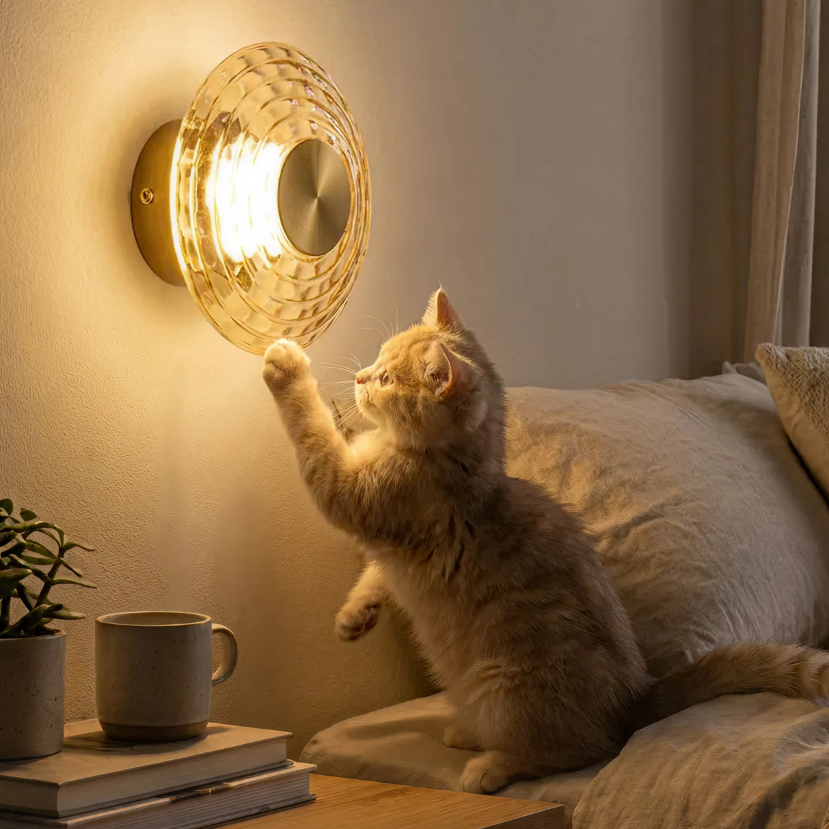 Корпус изготовлен из металла модного оттенка латуни. Круглый плафон диаметром 15см из стекла с насыщенной янтарной тонировкой закреплен на металлическом основании. Мощность изделия составляет 6Вт.