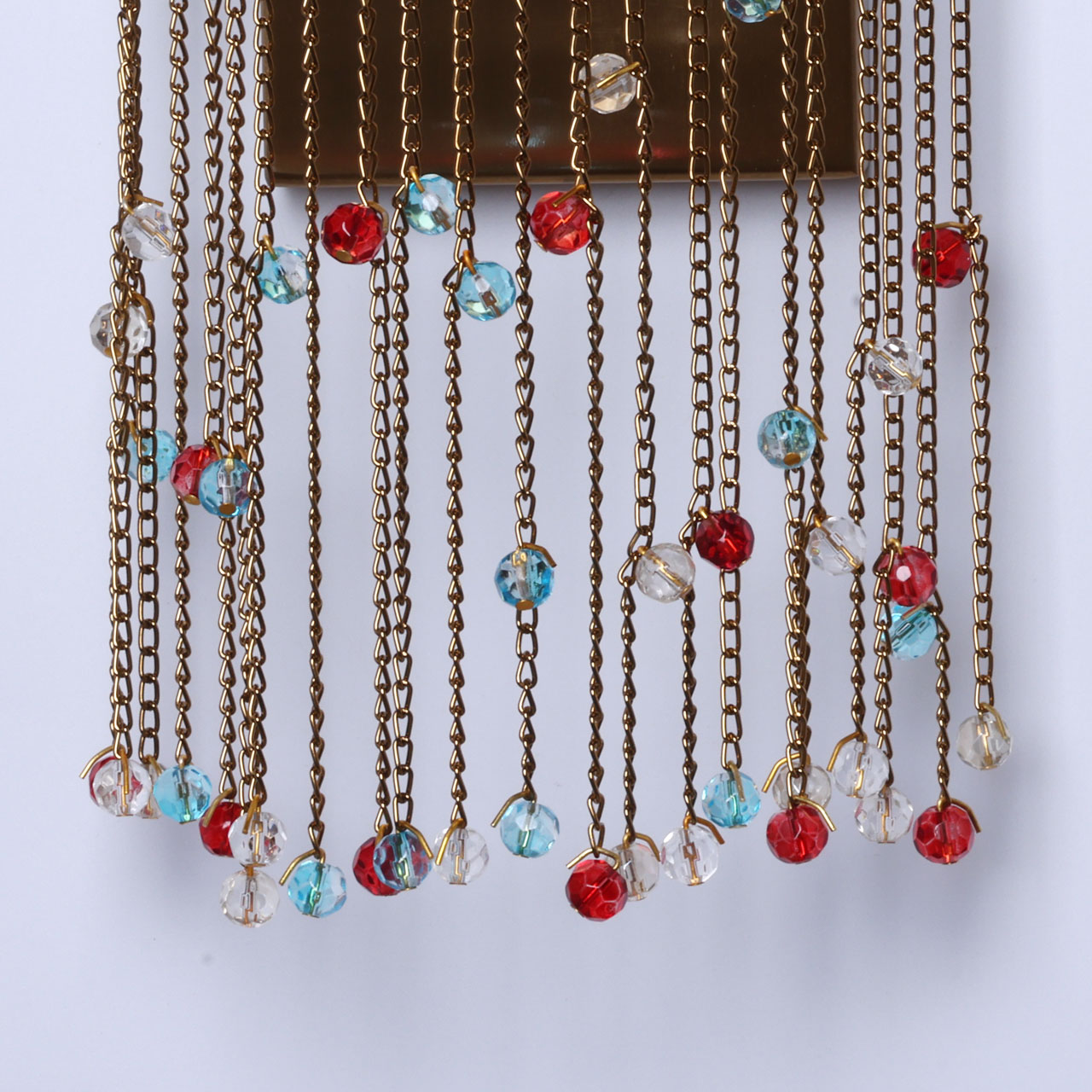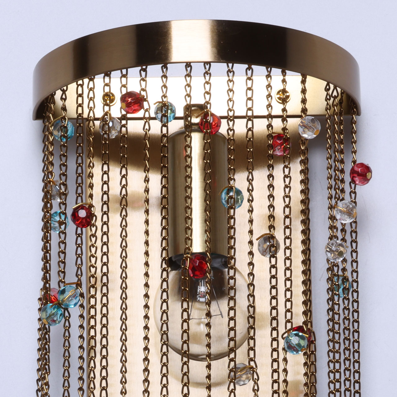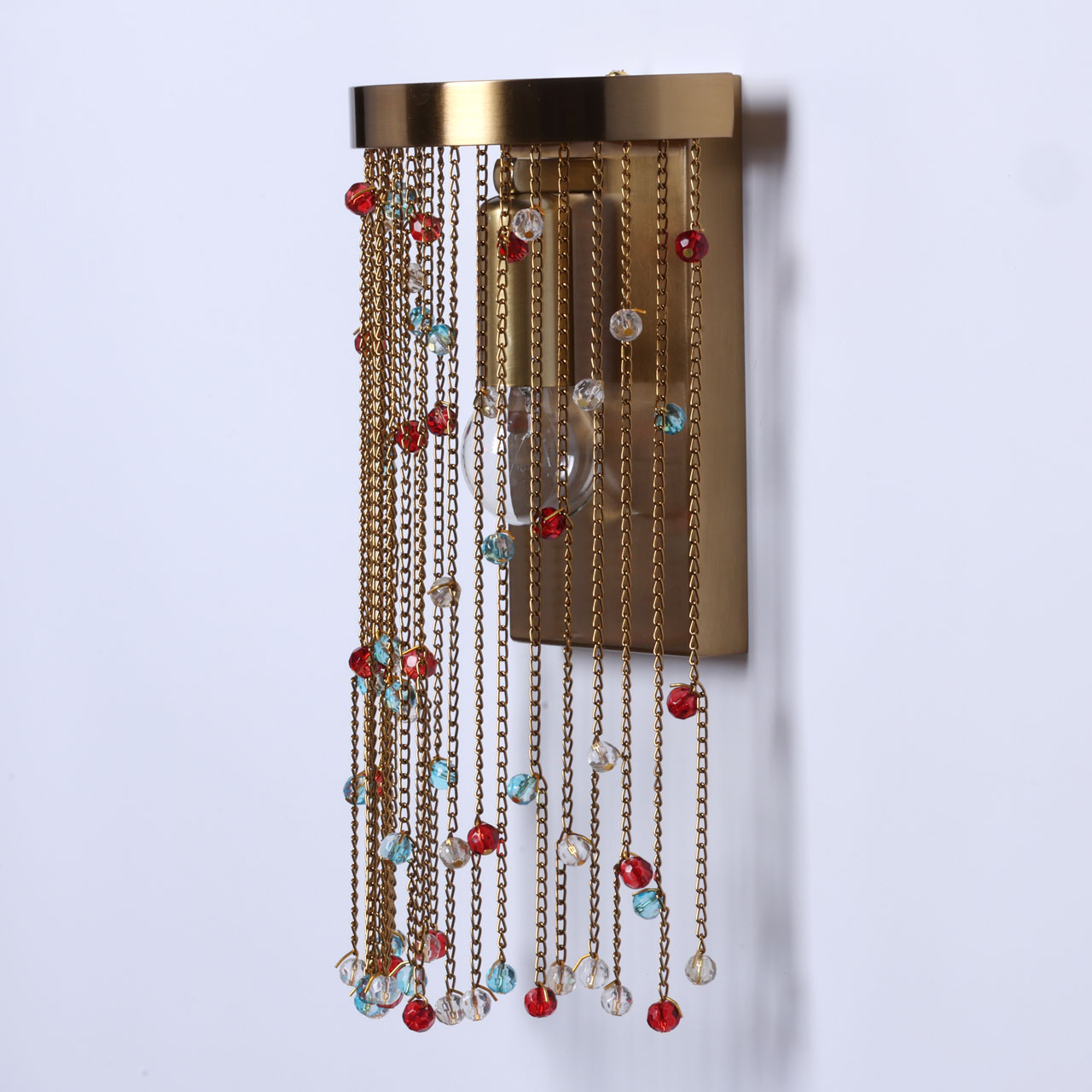 Металлическое основание настенного бра гальванизировано в цвет латуни. Светильник декорирован цепочками, гальванизированными в цвет основания и хрустальными бусинами, окрашенными в массе в голубой и красный цвета и прозрачными.