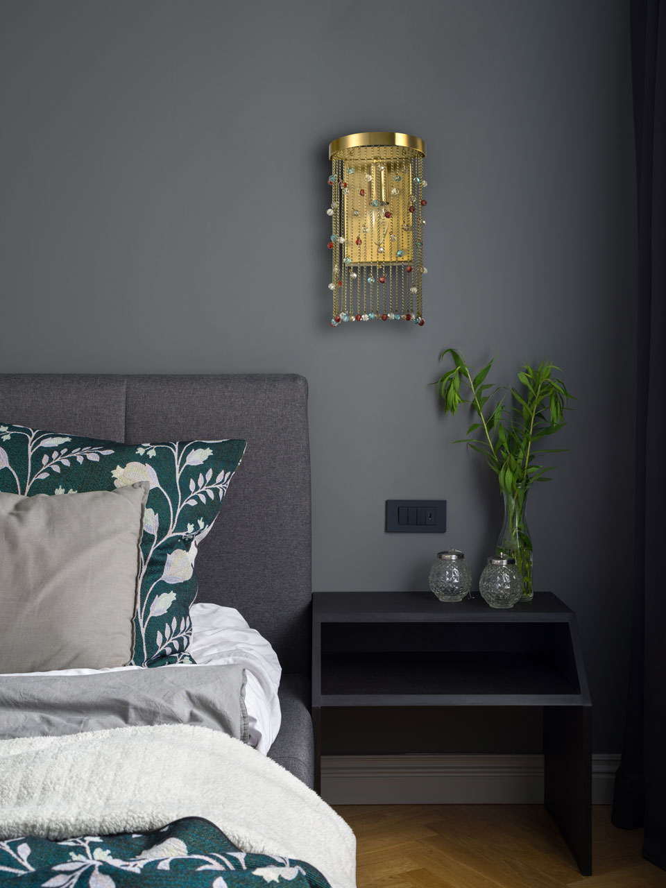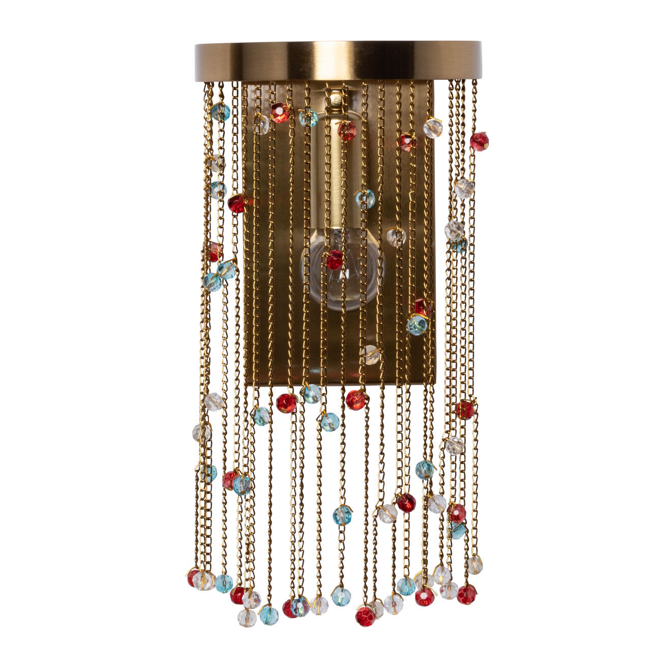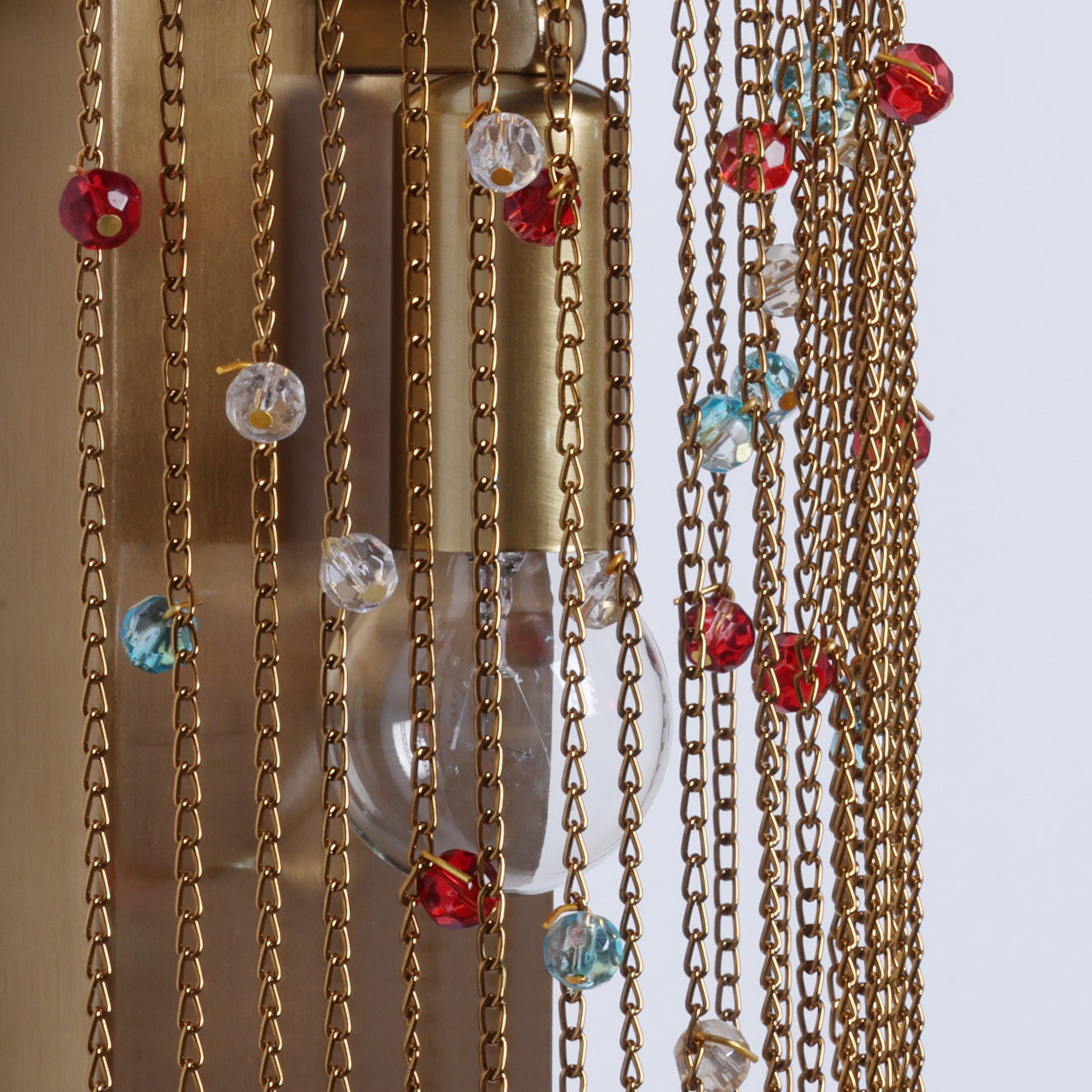 Металлическое основание настенного бра гальванизировано в цвет латуни. Светильник декорирован цепочками, гальванизированными в цвет основания и хрустальными бусинами, окрашенными в массе в голубой и красный цвета и прозрачными.