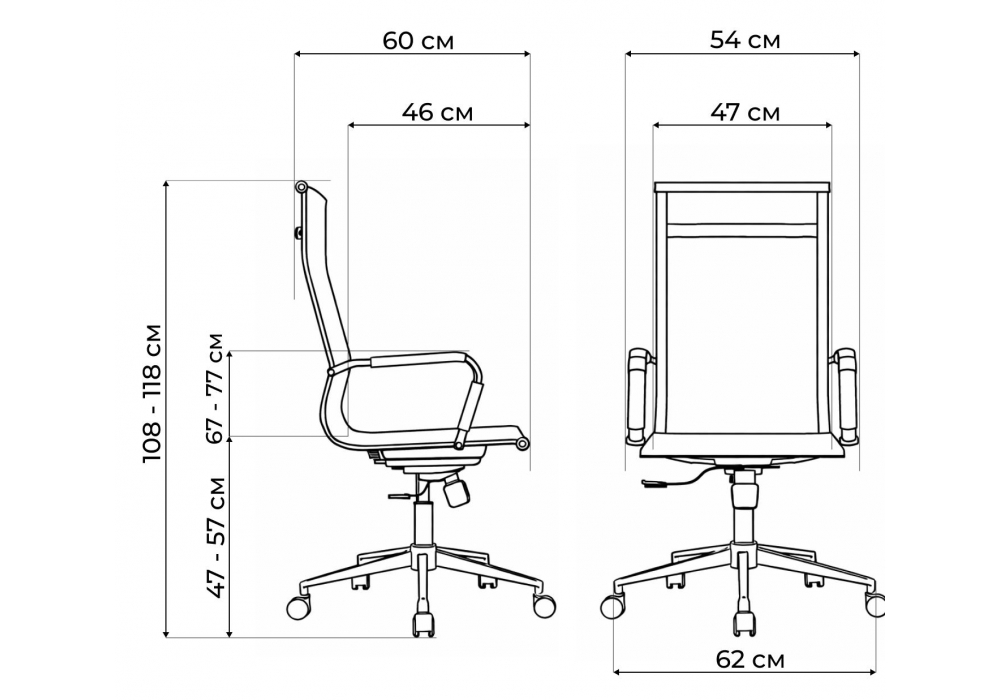Материал каркаса - металл; Материал сиденья - сетка, нейлон; Материал обивки - сетка, нейлон; Ширина - 54; Глубина - 60; Высота - 108; Ширина сиденья - 47; Глубина сиденья - 46; Высота сиденья - 47; Высота спинки - 61; Высота максимальная - 118;