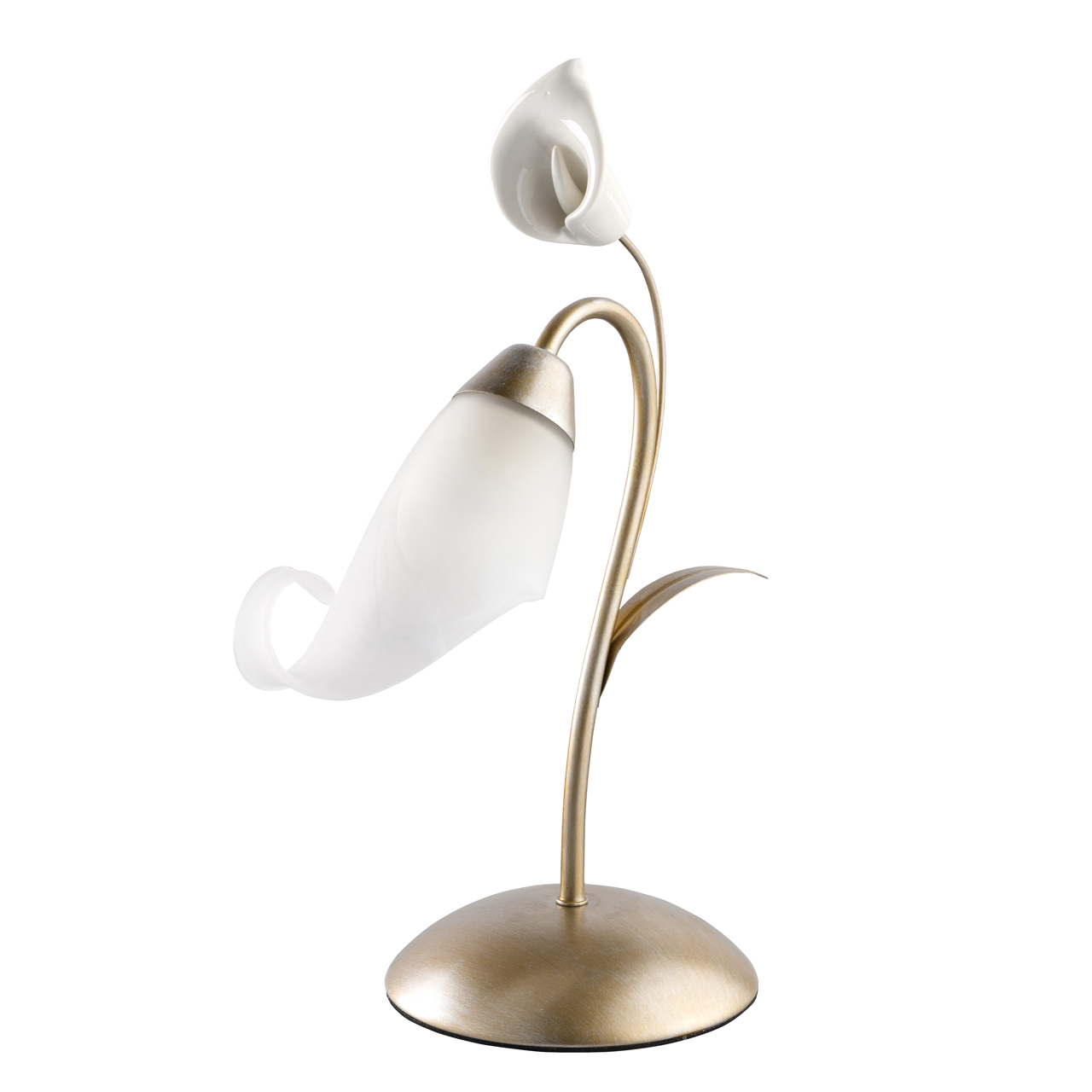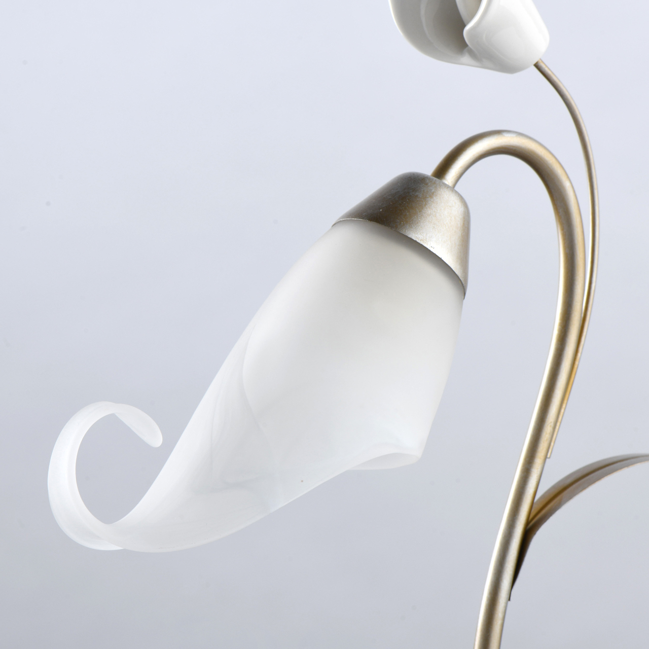 Основание светильника выполнено из металла и окрашено в цвет перламутрового золота. Плафон выполнен вручную из алебастрового стекла. Настольная лампа декорирована пластиком белого цвета.