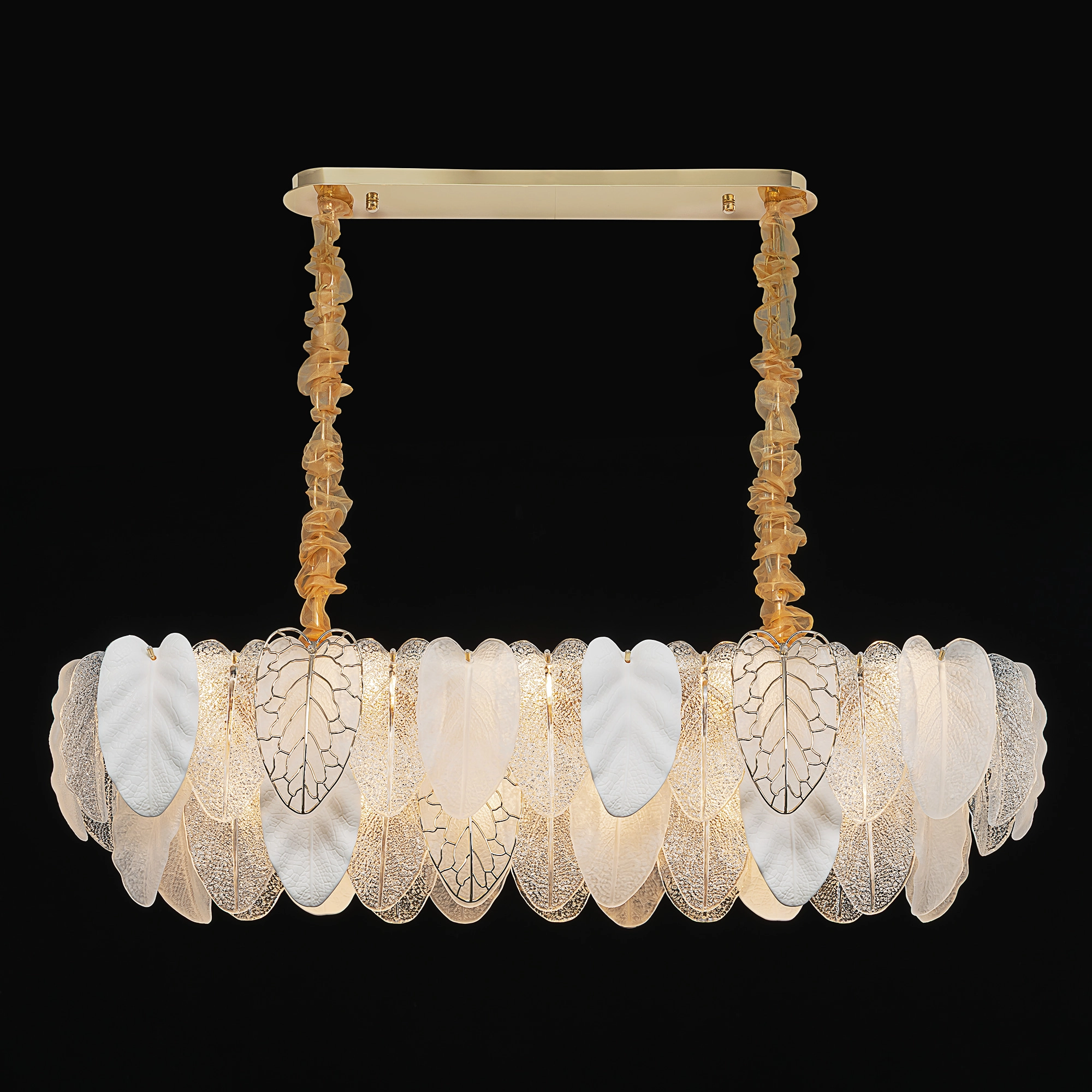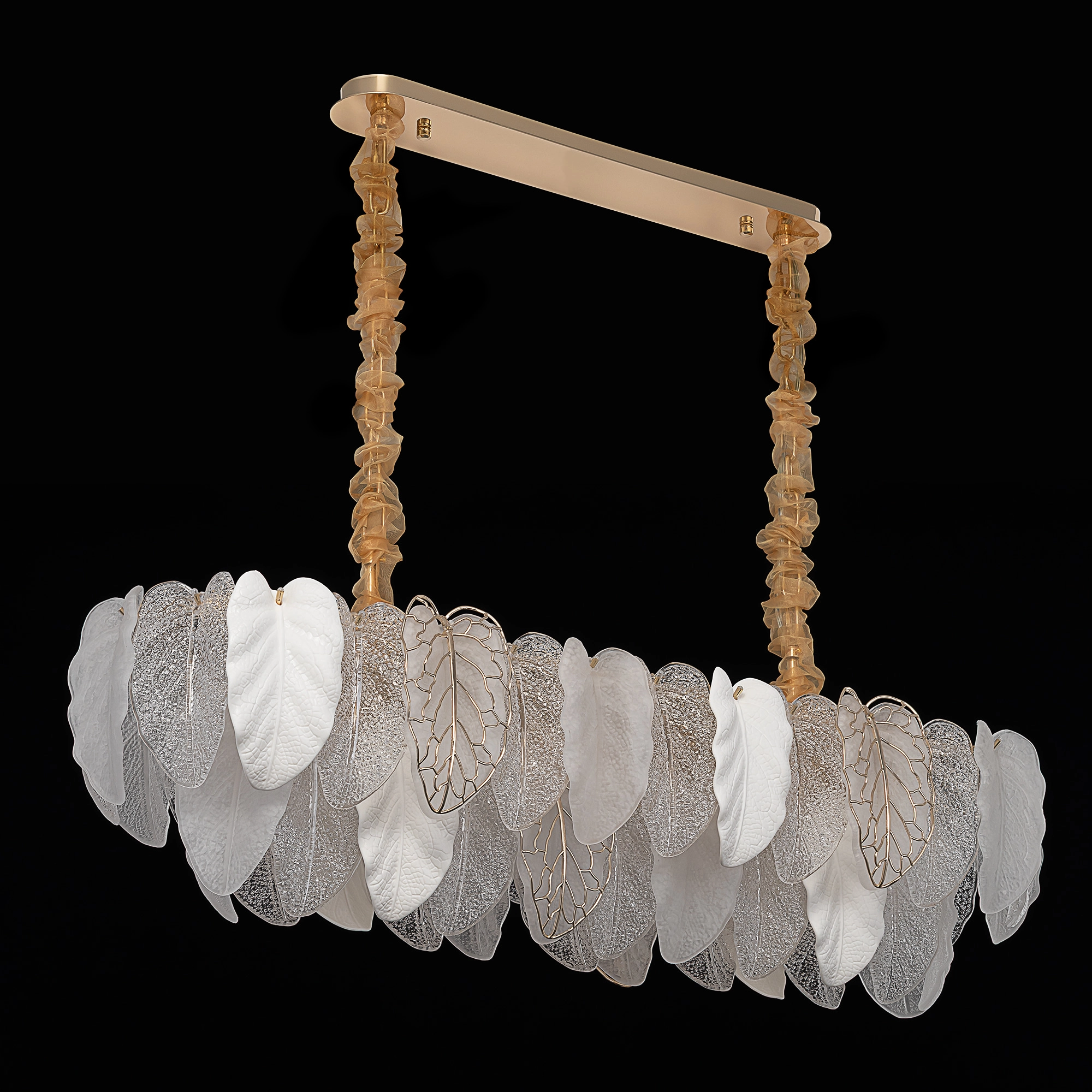 Металлический каркас золотистого оттенка переливается в лучах света. Листья из полуматового и прозрачного рифленого стекла, белой керамики, а также металлические листья с прожилками, отлитые по ювелирной технологии, подчеркивают флористическую изысканность и четкость силуэта люстры. В изделии используются 16 лампочек с цоколем Е14, высоту подвесных цепей можно отрегулировать.