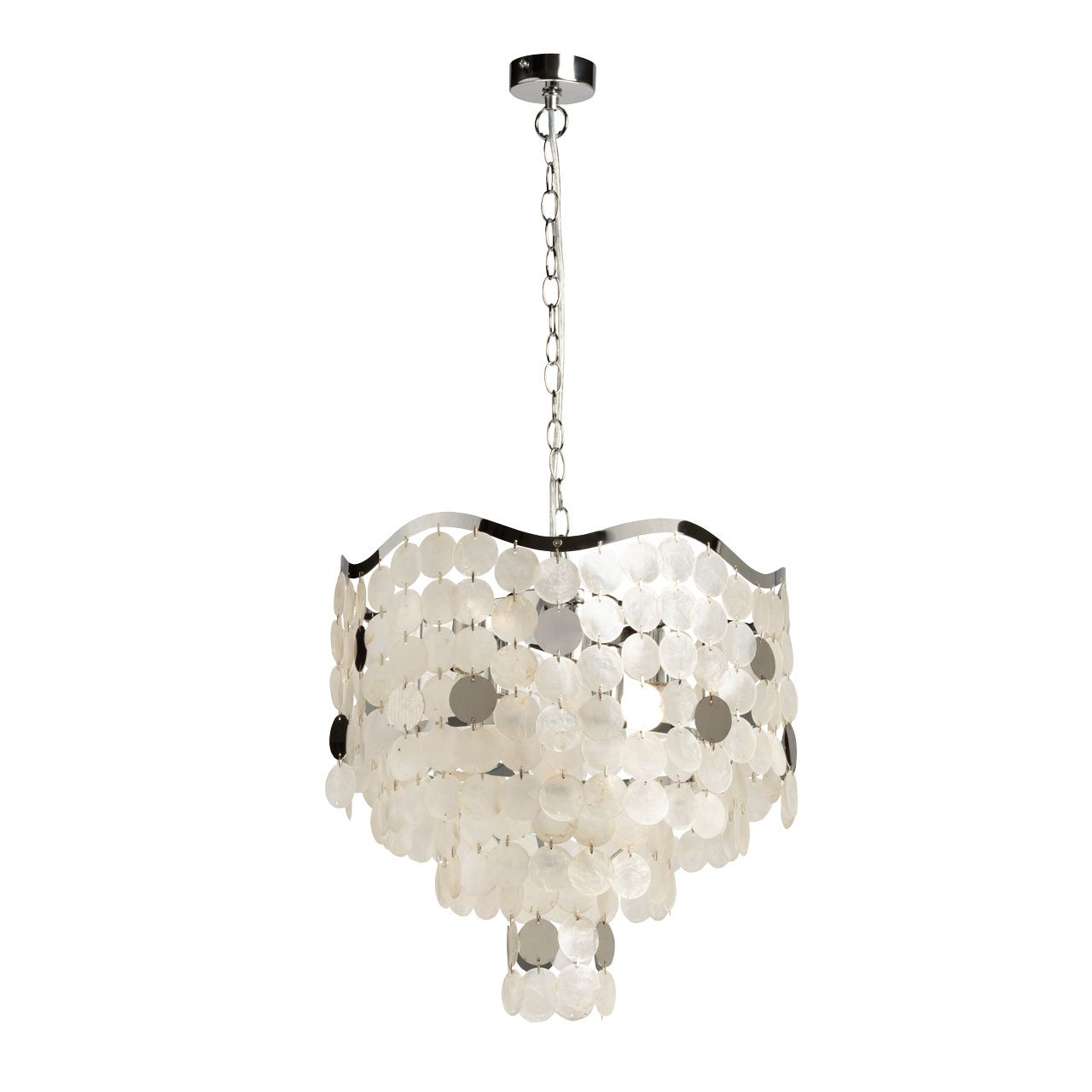 Металлическое основание подвесной люстры гальванизировано в цвет хрома. Люстра декорирована фактурными стеклянными пластинами цвета ракушек.