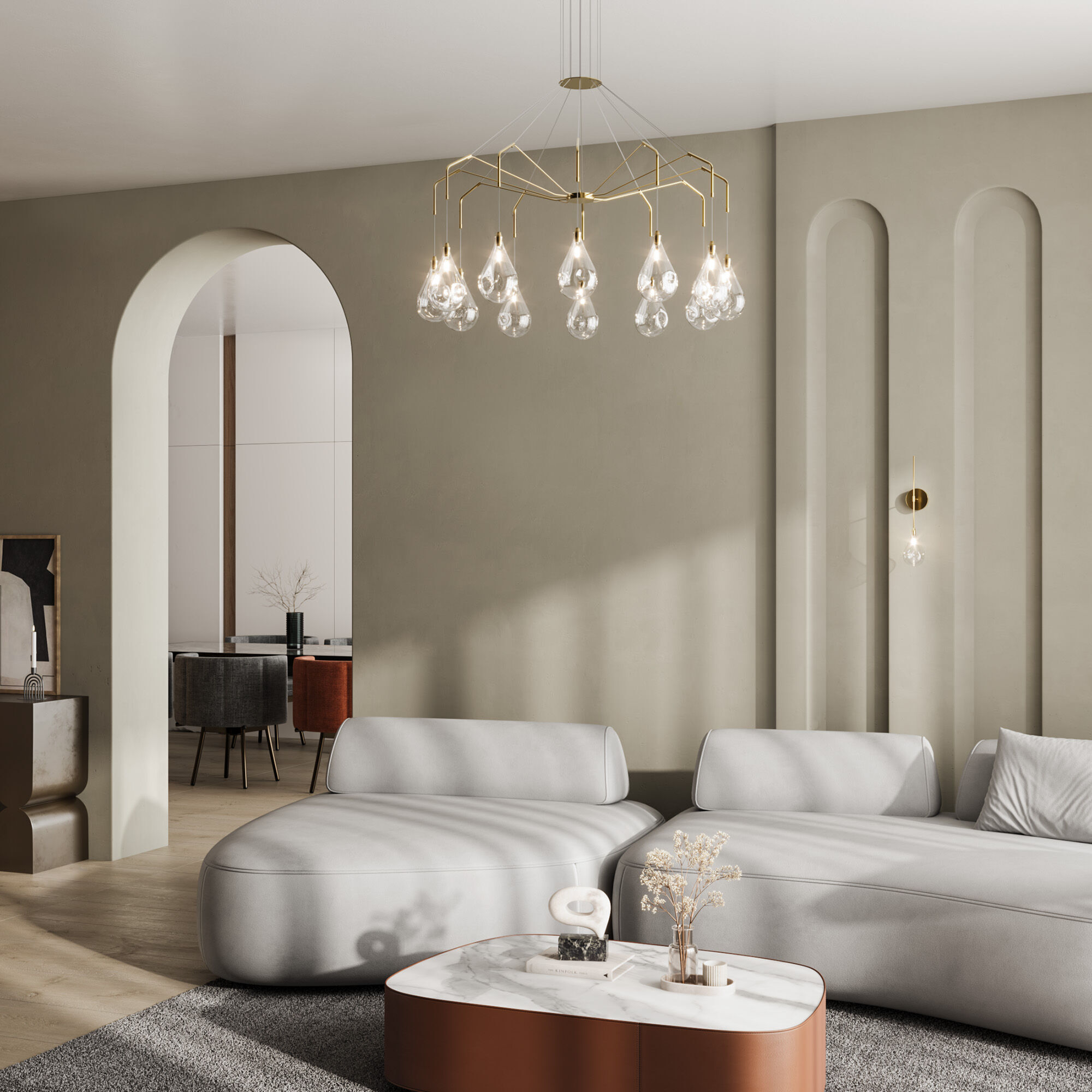 Светильник со стеклянными плафонами оснащен системой регулировки высоты подвеса, позволяющей размещать изделие на разных уровнях, уменьшая или увеличивая угол рассеивания светового потока.
