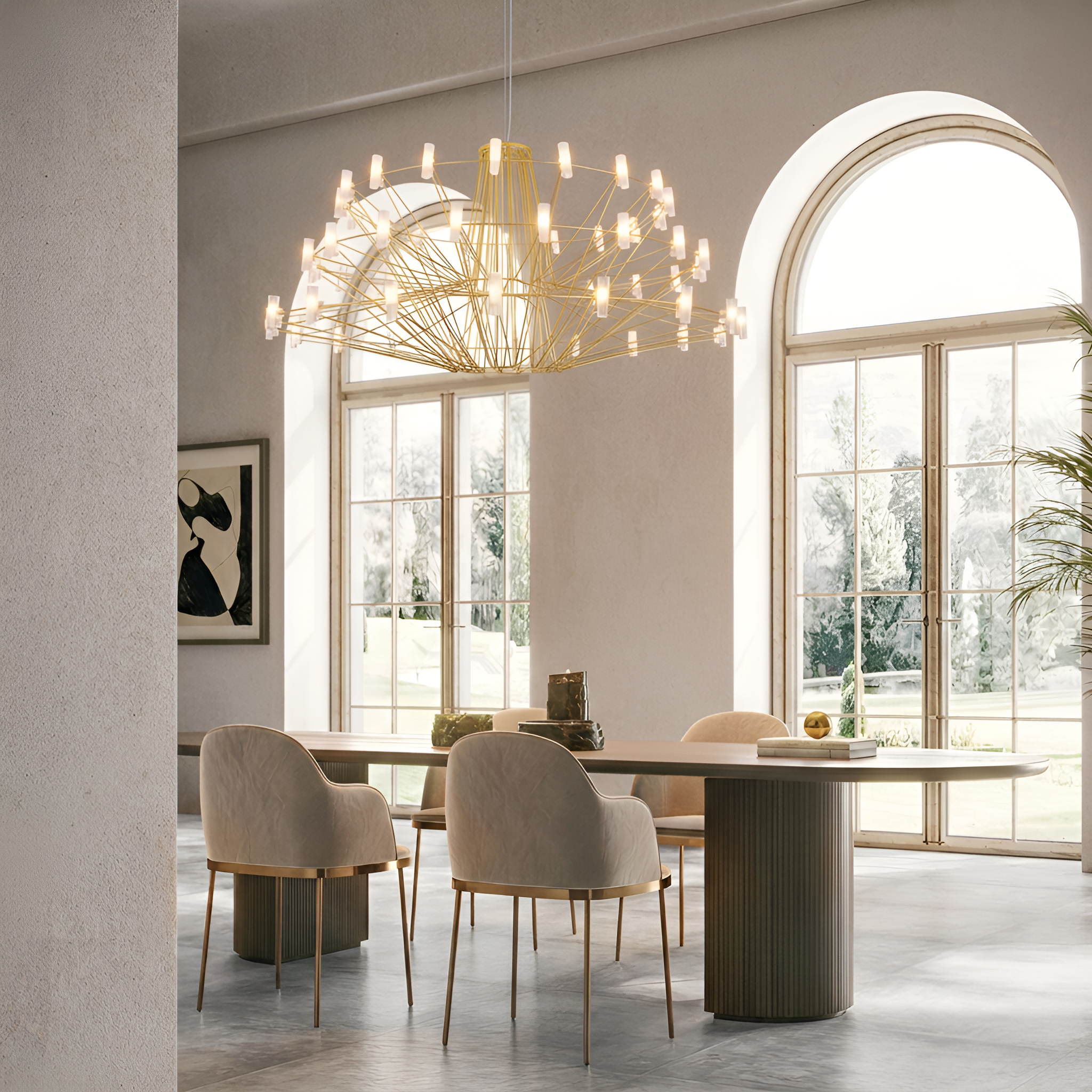 Металлический каркас в холодном оттенке придает люстре современный, немного футуристический характер. Она легко вписывается в минималистичные интерьеры, лофты, современные гостиные и просторные обеденные зоны, становясь главным декоративным объектом помещения. Над столом, в центре зала или в высоком холле такая люстра работает как арт-объект, задающий стиль всему пространству.