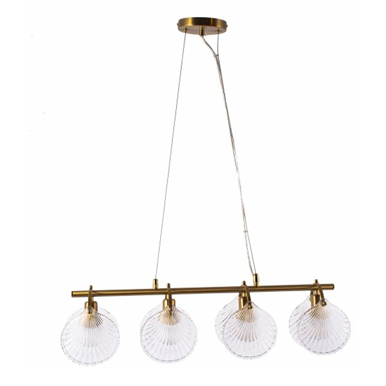 Металлическое основание подвесной люстры гальванизировано в цвет латуни. Источники света закрыты декоративными элеменатми в виде ракушек, отлитыми из прозрачного стекла.