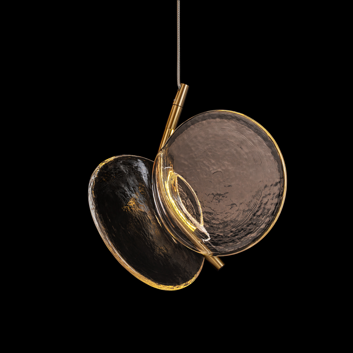 Основой композиции стали две прозрачные «линзы» из стекла. Они перекрывают друг друга, создавая игру света и тени, как будто перед вами хрупкие лепестки или ледяные диски, только что вынутые из морозного воздуха. Небольшое золотистое крепление в центре соединяет стеклянные элементы и добавляет образу утончённой ювелирности.