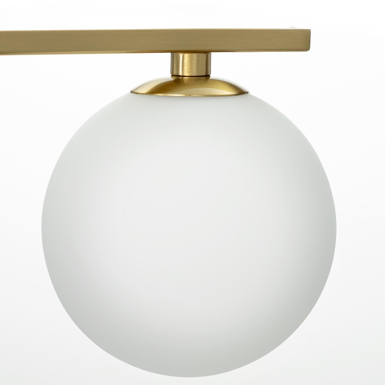 Корпус люстры изготовлен из металлического сплава стильного бронзового оттенка. Плафоны-сферы из белого матового стекла разного диаметра попарно расположены на горизонтальных рожках-штангах. Плафоны имеют диаметр 10 и 13см, размещены симметрично относительно центра люстры. Форма, материал и расположение плафонов обеспечивают мягкий заливной свет, который равномерно распределяется по всему помещению.