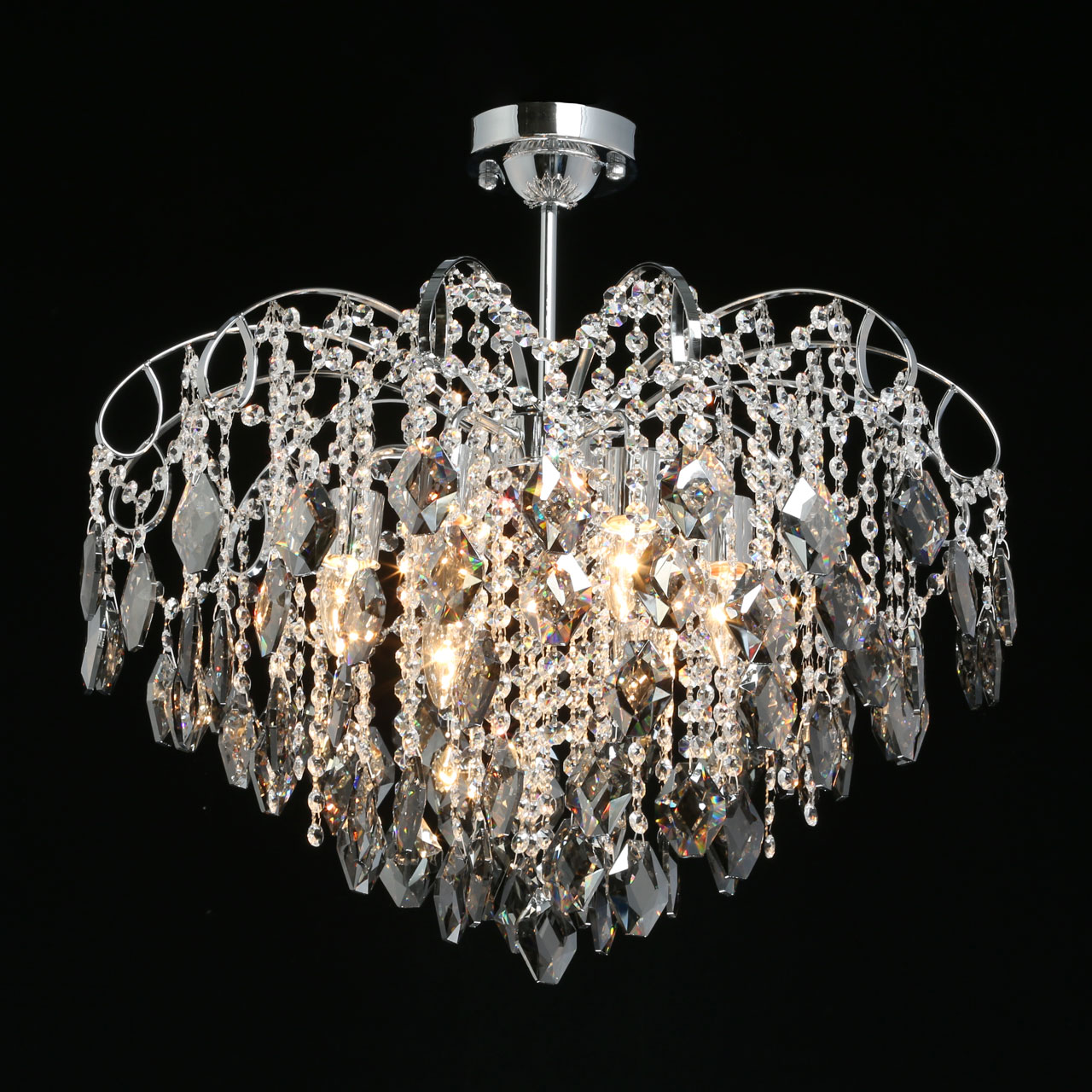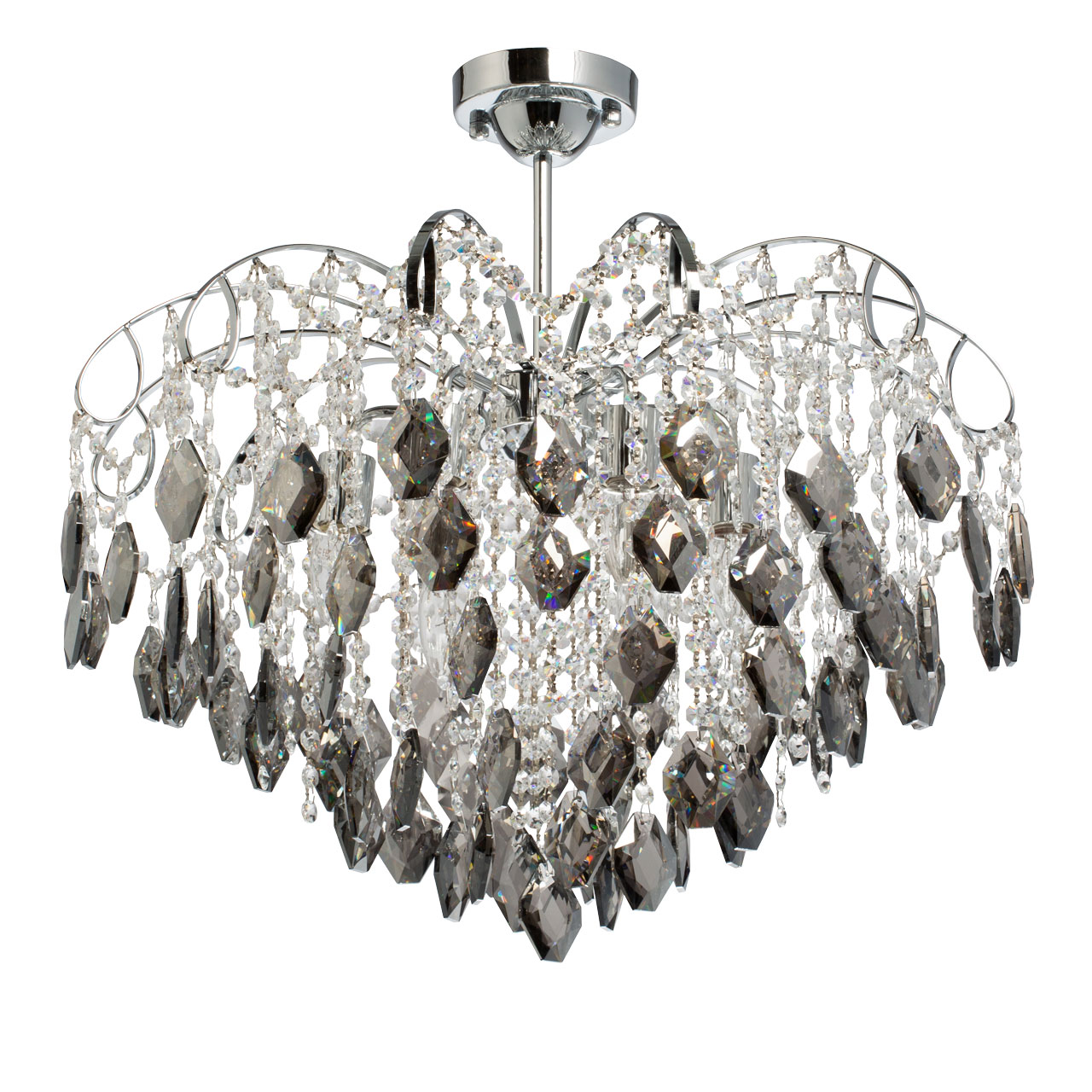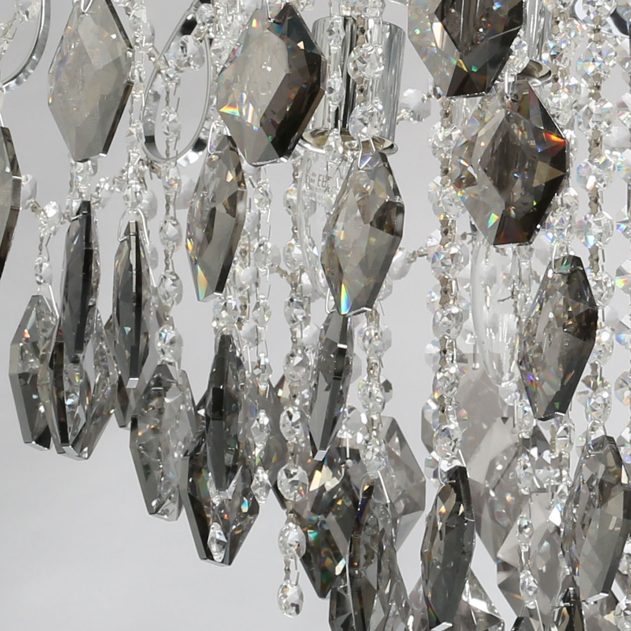 Металлическое основание гальванизировано в цвет хрома. Светильник декорирован хрусталем формы ромбов, гальванизированным в дымчатый цвет и прозрачным хрусталем в форме октагонов.