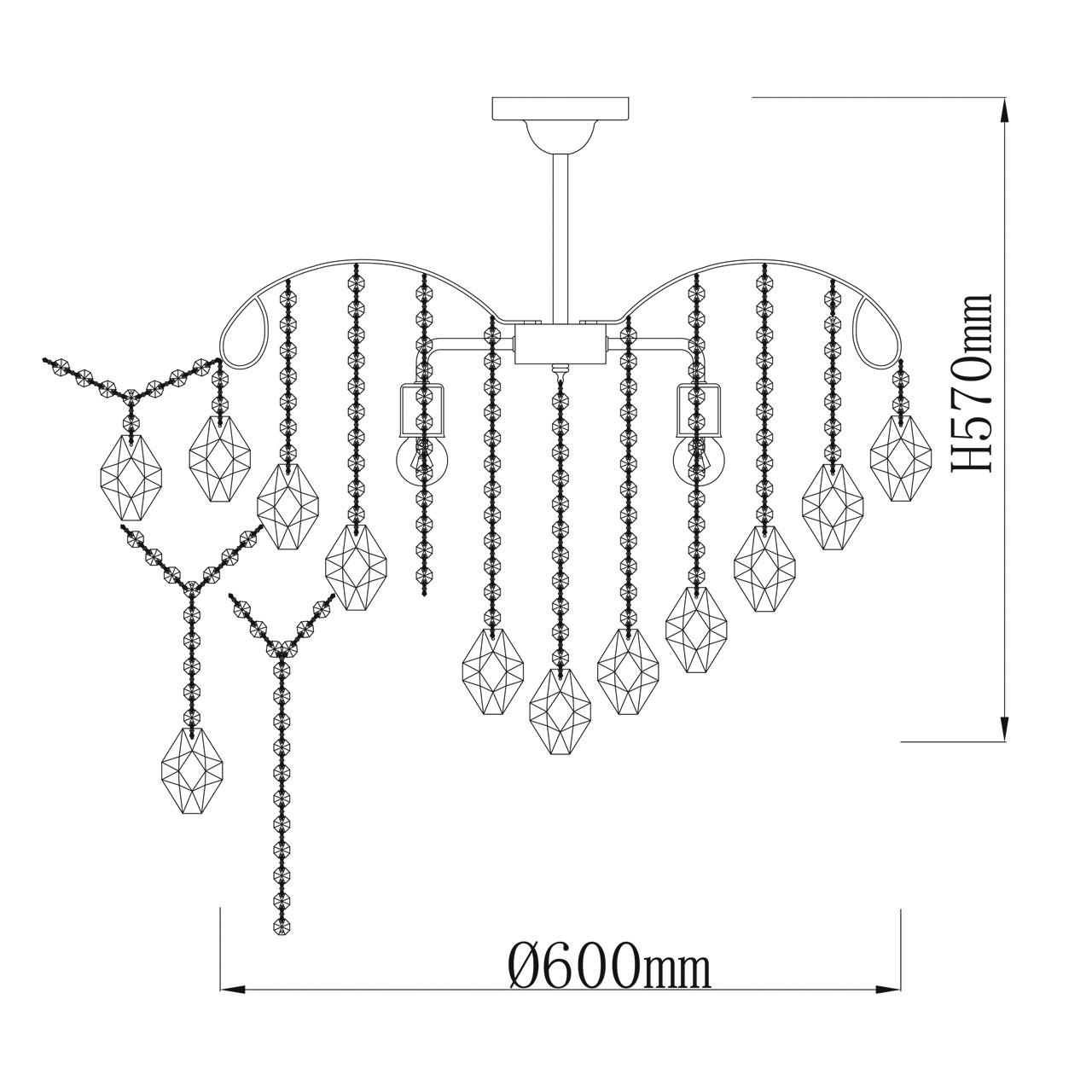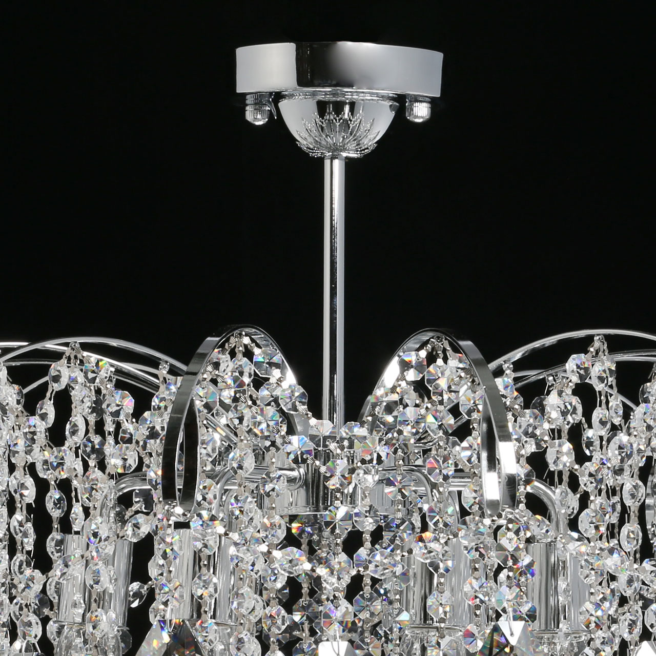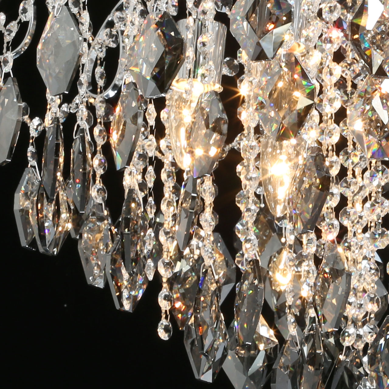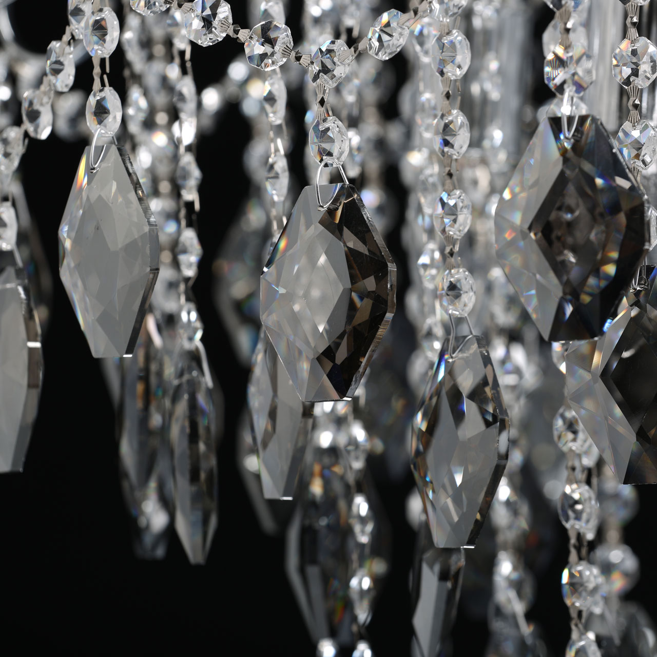 Металлическое основание гальванизировано в цвет хрома. Светильник декорирован хрусталем формы ромбов, гальванизированным в дымчатый цвет и прозрачным хрусталем в форме октагонов.