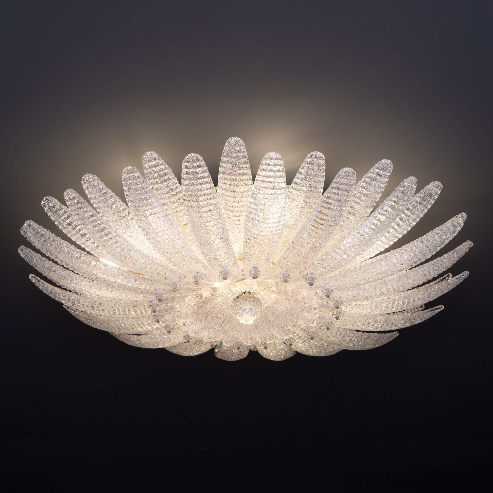 Потолочный светильник в форме цветка — изящное сияние в вашем интерьере. Светильник 101015/10 — не просто источник света, а настоящее украшение пространства. Рельефное стекло с алмазной крошкой создаёт эффект драгоценного цветка, застывшего в вечном цветении. В лучах света он оживает, наполняя комнату атмосферой утончённой роскоши и волшебства.