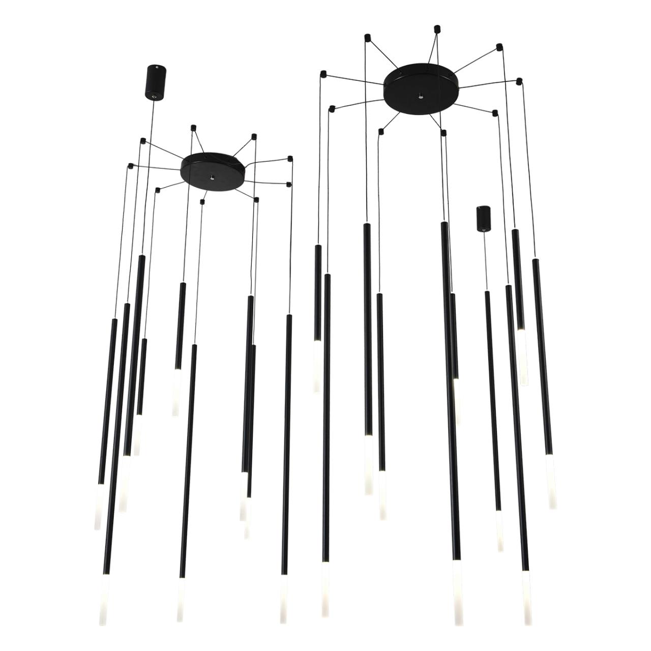 Линия STICK притягательна своей лаконичностью. Строгие формы создают визуальный ритм, а акриловые рассеиватели выглядят, как "световые колонны". Цилиндрические подвесы расположены на разной высоте, что добавляет динамики, напоминая нотный стан или абстрактную скульптуру арт-объекта. Тонкие тросы — визуально «облегчают» конструкцию, создавая эффект парящего света. Это особенно важно в минимализме, где важен баланс между массивностью и легкостью.