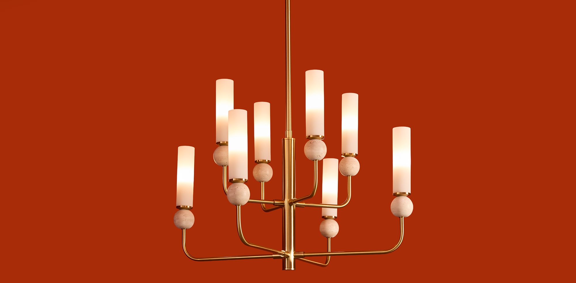 Серия Sunspot использует камень травертин как основной декоративный элемент. Настенные бра в двух вариантах: с матовым белым стеклянным плафоном и со «скользящим» теплым светом. Отличительная черта бра: увеличенный размер плафона и сенсорное включение/выключение без диммирования. Подвесные светильники имеют прозрачные стеклянные плафоны с декоративными шариками из камня травертин. Sunspot включают три модели подвесов разных размеров и форм стеклянной окантовки на плафон. Арматура — металл латунного и черного цвета Источники света LED 3000K и цоколь G9. Настольная лампа с touch переключателем . Серия создает комплексное зональное и акцентное освещение, подходящее для создания уютной атмосферы.