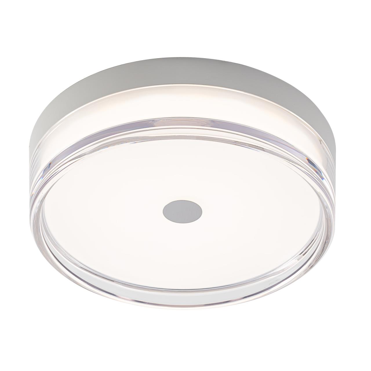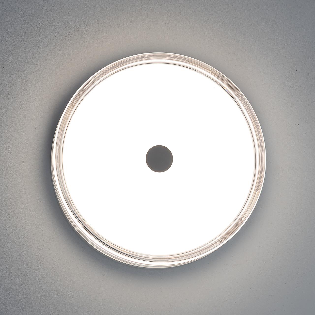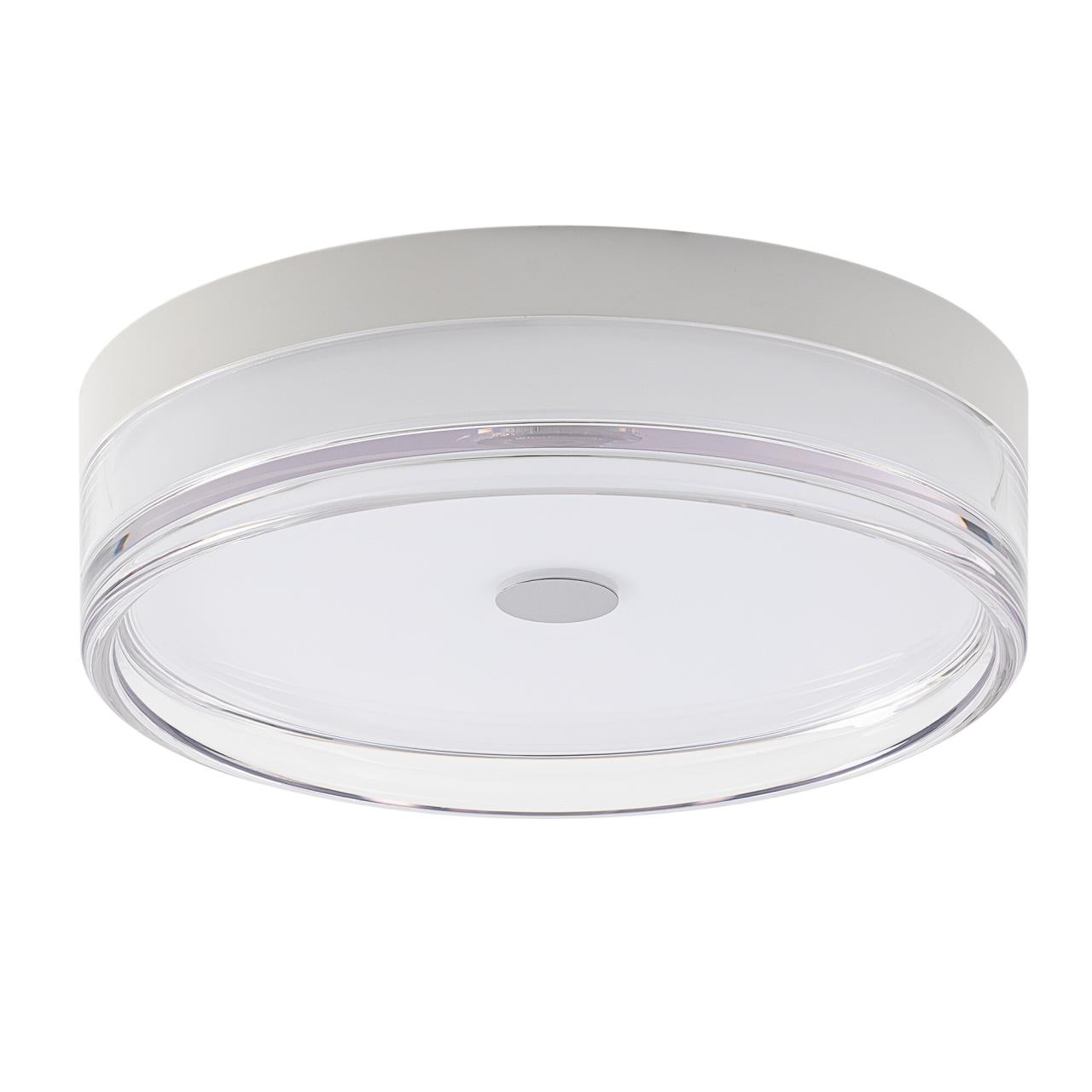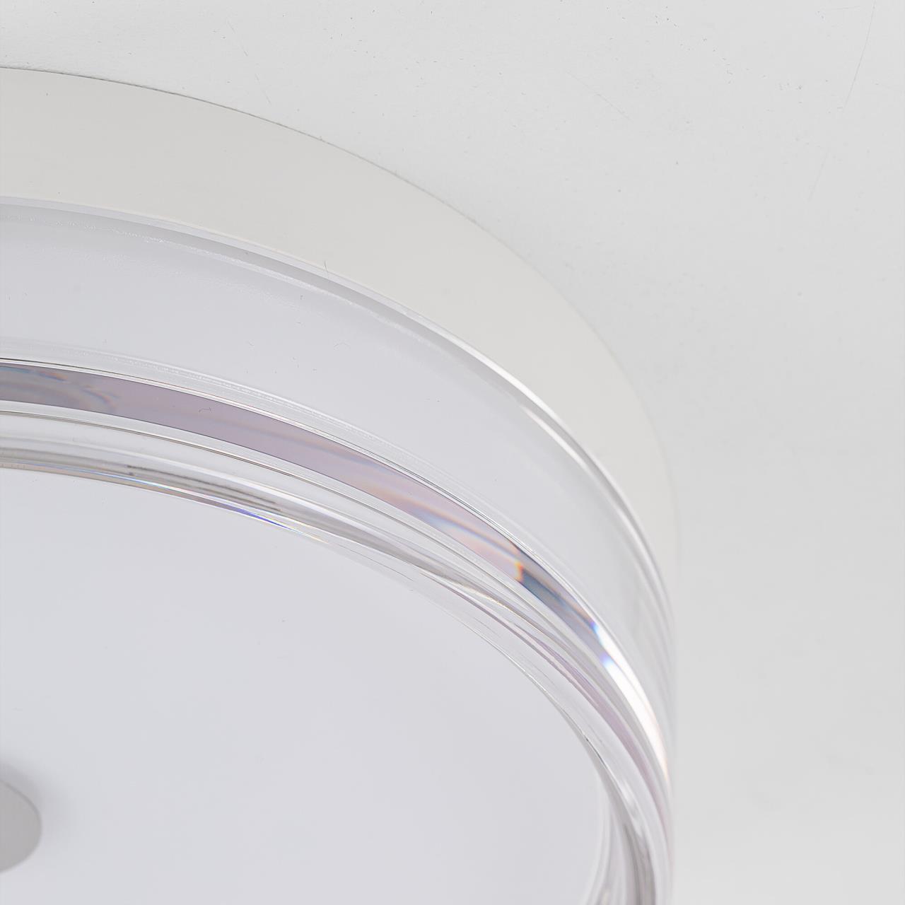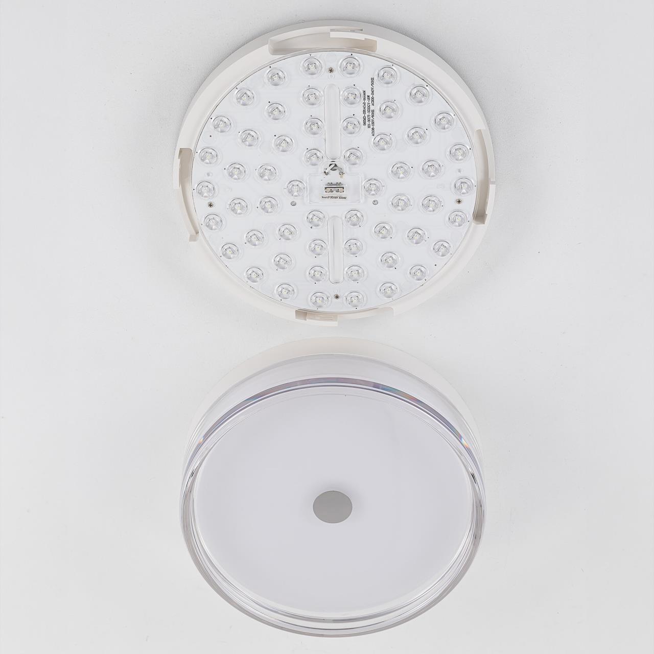 Корпус светильника изготовлен из высокопрочного полимера, рассеиватель — из оптического полимера, причем внешняя часть — прозрачная с глянцевой поверхностью, а внутри добавлена матовая вставка. Общий диаметр светильника — 23см. Источником света служат встроенные светодиоды, при установке вы можете выбрать температуру свечения (теплый, нейтральный или белый свет). Но в любом случае, свет не будет резать глаза и утомлять зрение, заливая пространство мягким потоком без мерцания и пульсаций.