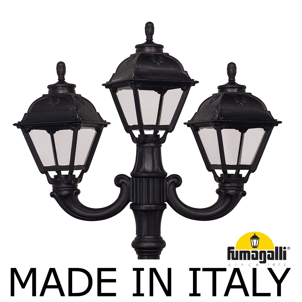 Садово-парковый фонарь FUMAGALLI среднего размера серии CEFA, модель RICU OFIR/CEFA 2L+1. Садовый светильник с 2 фонарями CEFA на консолях среднего размера OFIR + венчающий светильник, установленных на столбе RICU высотой 2,0 м (+высота фонаря). Предназначен для освещения парковых дорожек, cкверов, садовых и ландшафтных композиций, и других общественных пространств. Используется в качестве основного уличного освещения на городских улицах и площадях. Изготовлены в Италии, по уникальным технологиям "FUMATECH" из современного композитного полимера RESIN. Этот материал в 5 раз прочнее металла, не ржавеет, не окисляется, не выгорает на солнце, его не нужно красить. Все светильники пыле-влаго защищены по стандарту IP55 (Пылезащищенные, защита от водяных струй с любого направления). Рассеиватель выполнен из антивандального, не мутнеющего и не горючего PMMA (ПолиМетилМетаАкрилат). Срок службы светильника - не менее 20 лет. Температура использования от -60 до +90. В серии CEFA есть садовые фонари в настенном (OFIR/CEFA, MIRRA/CEFA) подвесном (SICHEM/CEFA) и наземном исполнении (IAFAET.R/CEFA, ALOE.R/CEFA, ARTU/CEFA, GIGI/CEFA, RICU/CEFA, NEBO/OFIR/CEFA 1L, NEBO/OFIR/ANNA 2L, TABOR/ADAM/CEFA 3L) со столбами разной высоты, с разным количеством и конфигурацией голов. Консоли настенных фонарей и кронштейны светильников на столбах освещения могут устанавливаться в положение вверх и вниз. Столбы выше 150 см имеют в основе мощную стальную трубу с двойной оцинковкой. При заказе требуется выбрать цвет корпуса, цвет плафона и тип патрона (Е-27 или LED GX-53). Возможен светодиодный вариант. По стилю и дизайну серия уличных светильников CEFA похожа на светильники большого размера серии SIMON . По размеру относится к средним парковым светильникам как серия RUT и GLOBE 300.