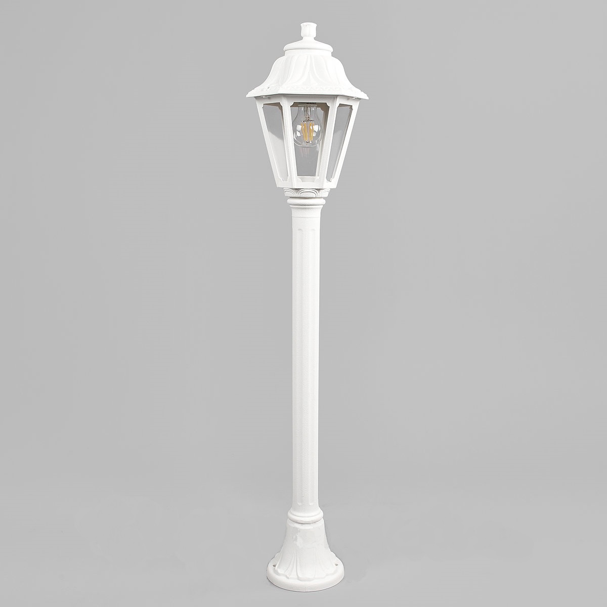 Садовый светильник-столбик FUMAGALLI серии ANNA, модель ANNA/MIZAR.R. Столбик освещения MIZAR.R и светильник ANNA. Используются для архитектурного и ландшафтного освещения в стиле "классика". Место установки столбиков освещения - парковые дорожки, тротуары, газоны в парках и скверах, а так же ландшафтные и архитектурные объекты. Изготовлены в Италии, по уникальным технологиям "FUMAGALLI" из современного композитного полимера RESIN. Этот материал в 5 раз прочнее металла, не ржавеет, не окисляется, не выгорает на солнце, его не нужно красить. Все светильники пыле-влаго защищены по стандарту IP55 (защита от пыли, защита от струй воды, падающих под любым углом). Рассеиватель выполнен из антивандального, не мутнеющего и не горючего PMMA (ПолиМетилМетаАкрилат). Срок службы светильника - не менее 20 лет. Температура использования от -60 до +90. В серии ANNA есть фонари в настенном (BISSO/ANNA, PORPORA/ANNA) подвесном (SICHEM/ANNA, SICHEM/ANNA 3L) и наземном исполнении (IAFAET.R/ANNA, ALOE.R/ANNA, ARTU/ANNA, GIGI/ANNA, RICU/ANNA, RICU/ISSO/ANNA 1L, RICU/ISSO/ANNA 2L, RICU/ISSO/ANNA 3L) со столбами разной высоты, с разным количеством и конфигурацией голов. Консоли настенных фонарей и кронштейны светильников на столбах освщения могут устанавливаться вверх/вниз. Столбы выше 150 см имеют в основе мощную стальную трубу с двойной оцинковкой. При заказе требуется выбрать цвет корпуса, цвет плафона и тип патрона (Е-27 или LED GX-53). Возможен светодиодный вариант. По стилю и дизайну серия уличных светильников ANNA похожа на светильники среднего размера серии RUT и на светильники большого размера серии NOEMI. По размеру ANNA относится к малым светильникам как серия SABA и GLOBE 250.