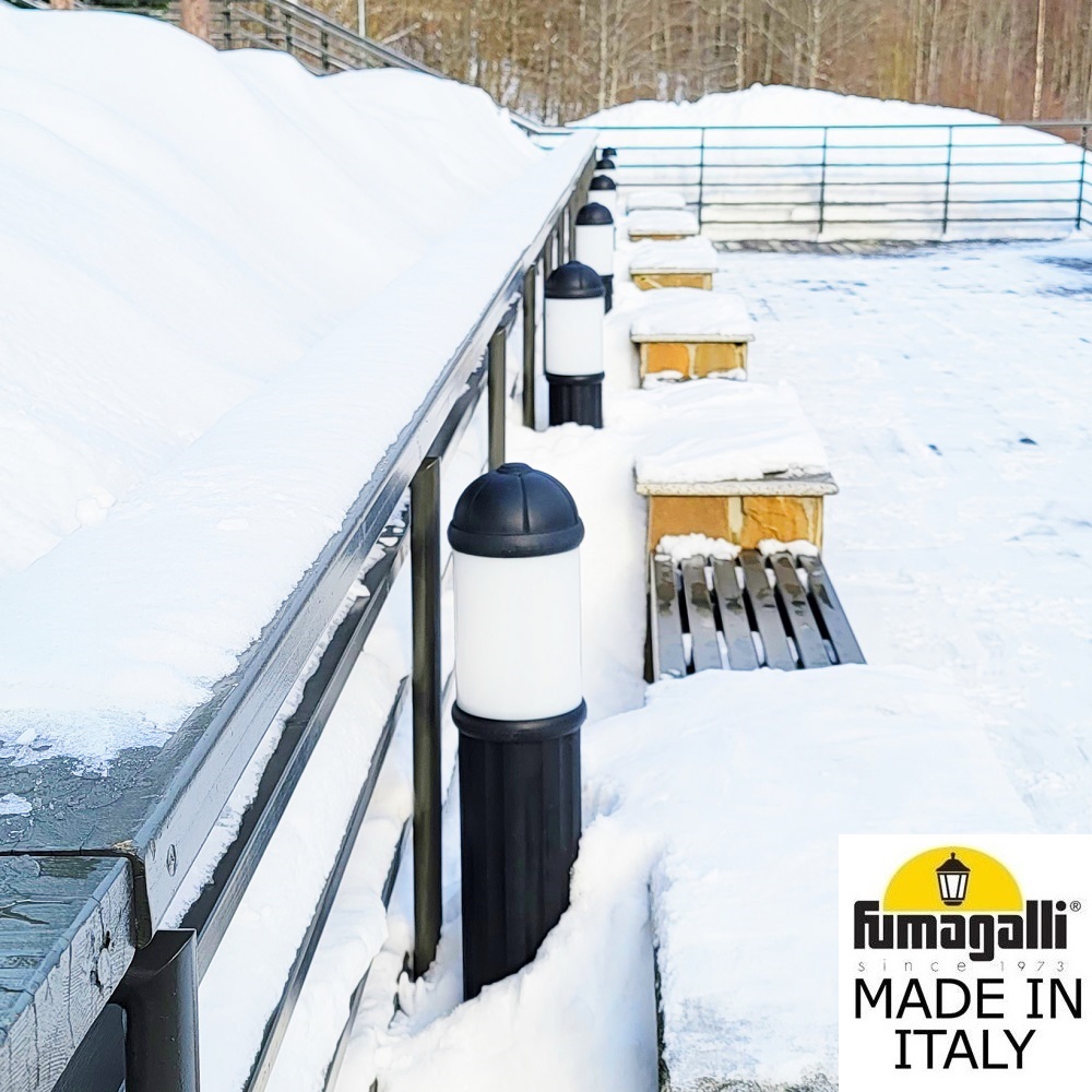 Садовый светильник-столбик FUMAGALLI серии SAURO, модель SAURO 1100 - изготовлен в Италии. Используются для освещения парковых дорожек, газонов, парковок, набережных, как элементы ландшафтного и светового дизайна. Рассеиватель молочного цвета равномерно распределяет свет лампы. Корпус изготовлен из современного вандалостойкого, негорючего полимера RESIN. Прочного, окрашенного в массе, не ржавеющего, не выгорающего на солнце, не проводящего электричество. Все светильники пыле-влаго защищены по стандарту IP55. Рассеиватель выполнен из толстого антивандального, не мутнеющего и не горючего PMMA (ПолиМетилМетаАкрилат). Срок службы светильника - не менее 20 лет, в течении которого парковый светильник не нужно красить и как либо обслуживать. Температура эксплуатации от -60 до +90. При заказе требуется выбрать цвет корпуса, цвет плафона и тип патрона. Серия SAURO включает в себя светильники высотой 0,50 метра, 0,80 метра, 1,10 метра, а так же уличный светильник MIRELLA с установкой на стену. Дополнительно можно использовать столбики- ограждения NARDO высотой 60 и 90 сантиметров. Между столбиков можно натягивать цепочку. Также светильник-столбик с цоколем Е27, может комплектоваться хромированным или белым рассеивателем на лампу. Закладные крепежные элементы паркового столба SAURO - в комплекте.