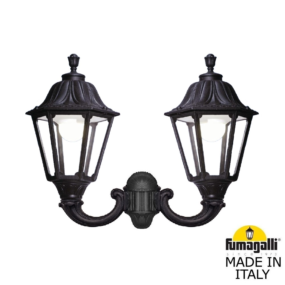 Светильник уличный настенный FUMAGALLI большого размера серии NOEMI, модель MIRRA/NOEMI. Двойной настенный уличный фонарь, большого размера с креплением на стену с помощью 2 консолей OFIR среднего размера. Устанавливается на стены домов, котеджей, заборов и других вертикальных поверхностей. Используется для освещения входных групп, общего уличного освещения, декоративной и фасадной подсветки. Изготовлены в Италии, по уникальным технологиям "FUMATECH" из современного композитного полимера RESIN. Этот материал в 5 раз прочнее металла, не ржавеет, не окисляется, не выгорает на солнце, его не нужно красить. Все светильники пыле-влаго защищены по стандарту IP55 (Пылезащищенные, защита от водяных струй с любого направления). Рассеиватель выполнен из антивандального, не мутнеющего и не горючего PMMA (ПолиМетилМетаАкрилат). Срок службы светильника - не менее 20 лет. Температура использования от -60 до +90. В серии NOEMI есть садовые фонари в настенном (OFIR/NOEMI, MIRRA/NOEMI) подвесном (SICHEM/NOEMI) и наземном исполнении (IAFAET.R/NOEMI, ALOE.R/NOEMI, ARTU/NOEMI, GIGI/NOEMI, RICU/NOEMI, NEBO/OFIR/NOEMI 1L, NEBO/OFIR/NOEMI 2L, TABOR/ADAM/NOEMI 3L) со столбами разной высоты, с разным количеством и конфигурацией голов. Консоли настенных фонарей и кронштейны светильников на столбах освещения могут устанавливаться в положение вверх и вниз. Столбы выше 150 см имеют в основе мощную стальную трубу с двойной оцинковкой. При заказе требуется выбрать цвет корпуса, цвет плафона и тип патрона (Е-27 или LED GX-53). Возможен светодиодный вариант. По стилю и дизайну серия уличных светильников NOEMI похожа на светильники среднего размера серии RUT и на светильники малого размера серии ANNA. По размеру относится к большим парковым светильникам как серия SIMON и GLOBE 400.