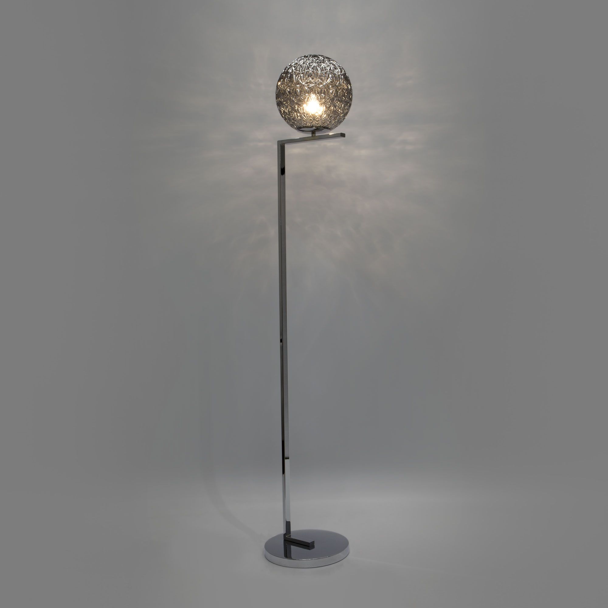 Благодаря дымчатому стеклянному плафону напольный светильник создает мягкое рассеянное свечение. Прочный металлический корпус светильника устойчив к механическим воздействиям, а защитное покрытие обеспечивает надежную электроизоляцию и презентабельный внешний вид.