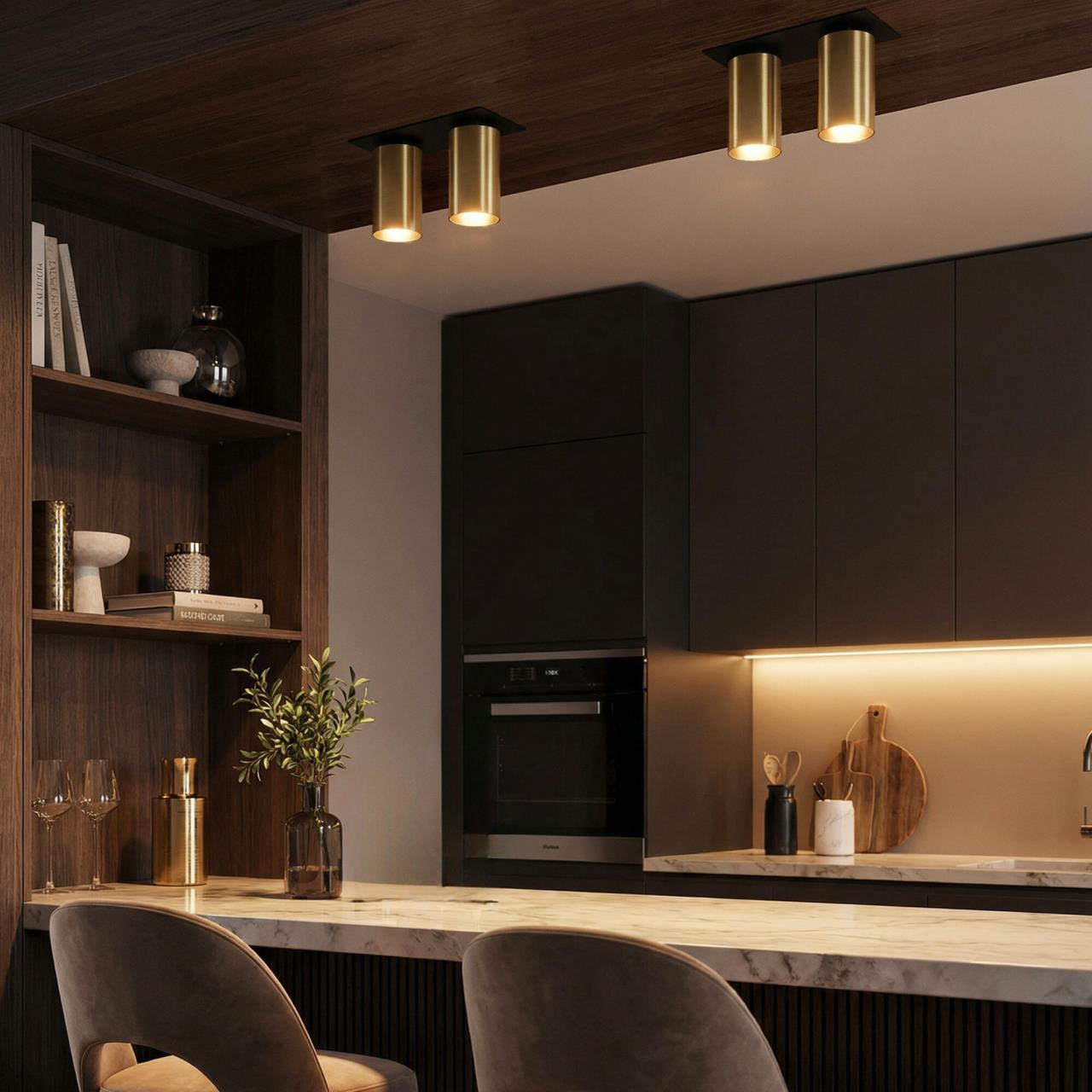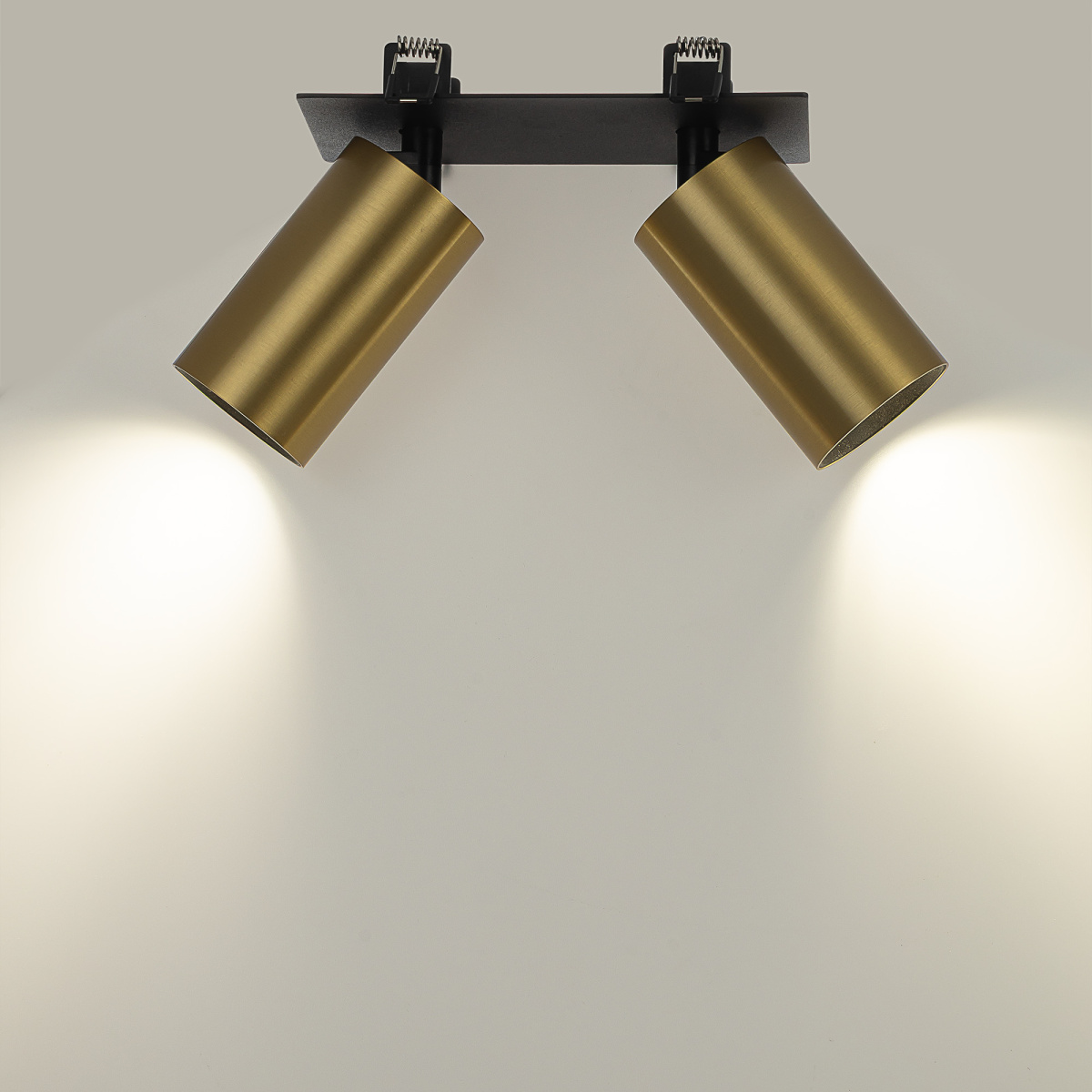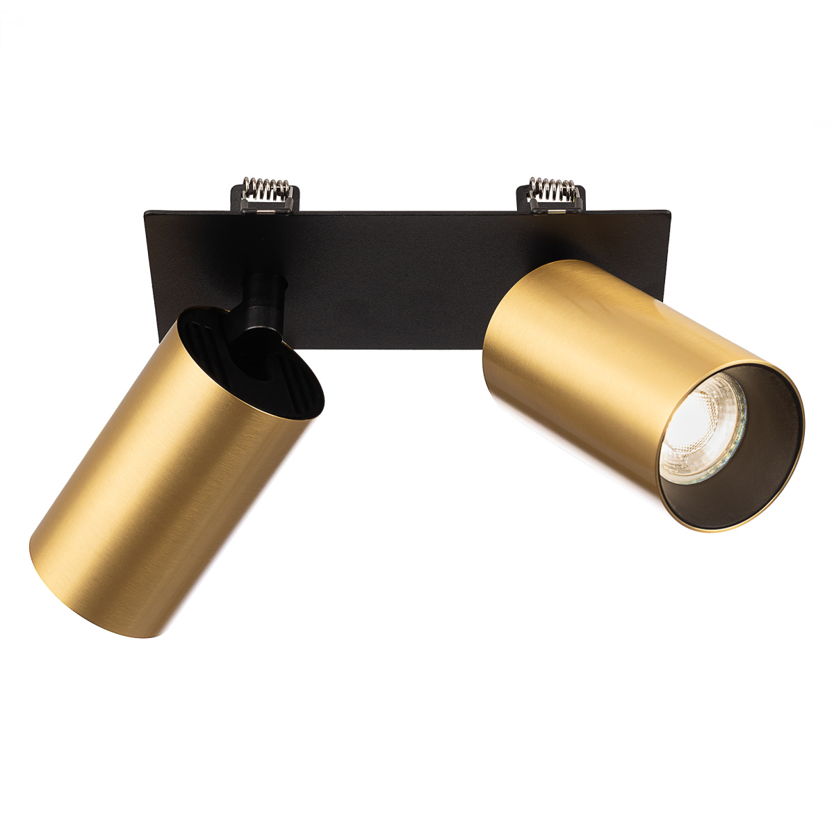 Корпус модели металлический, стильного латунного оттенка. Плафоны цилиндрической формы имеют поворотное крепление, позволяющее менять направление светового луча. Источником света служат две светодиодные лампочки с цоколем GU10 мощностью не более 10Вт, встраиваемый тип крепления. Плафоны вращаются независимо друг от друга, что дает возможность формировать разный рисунок света.